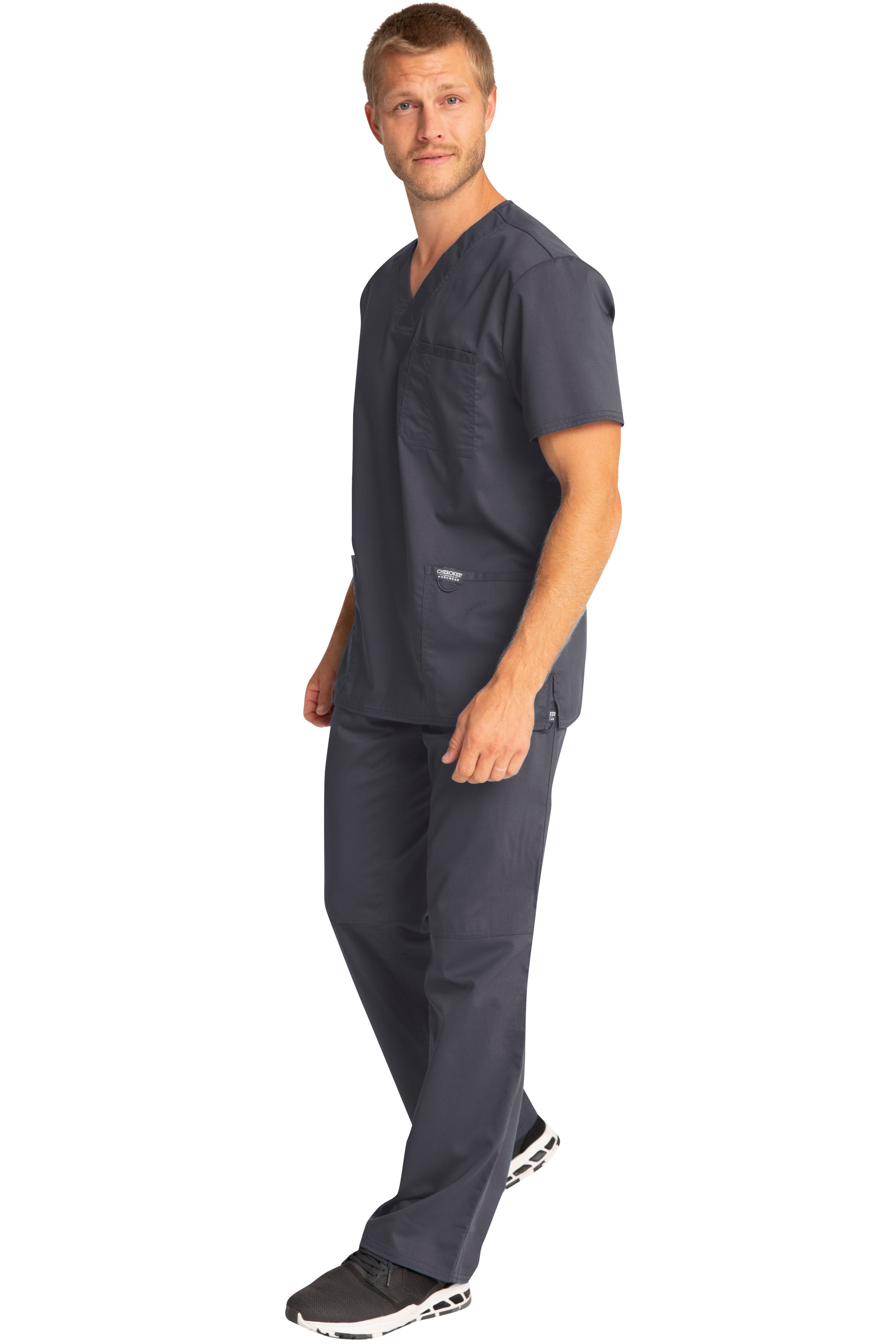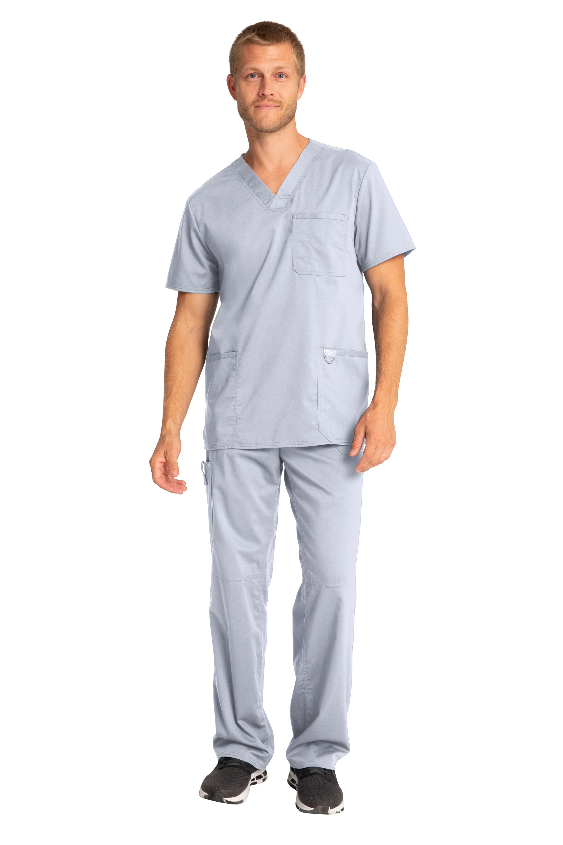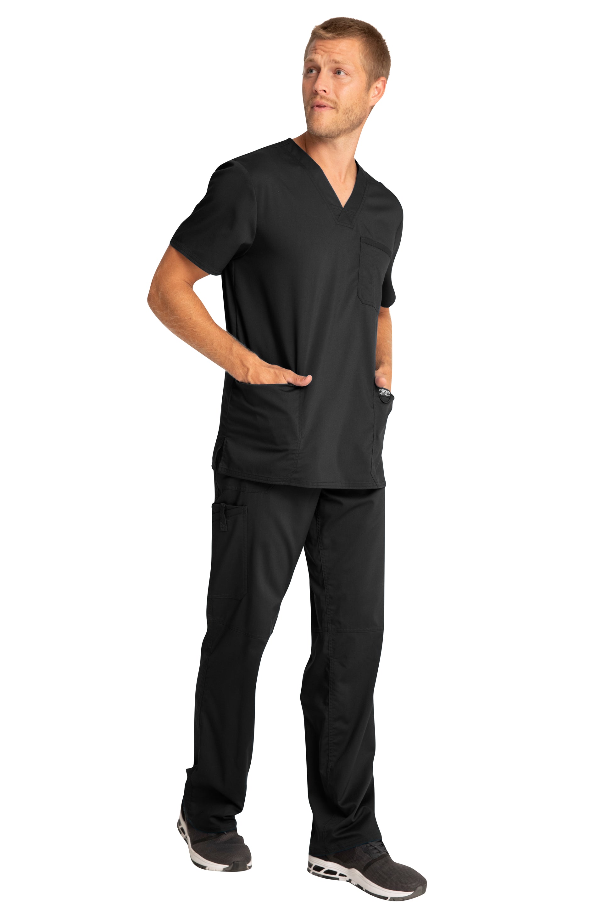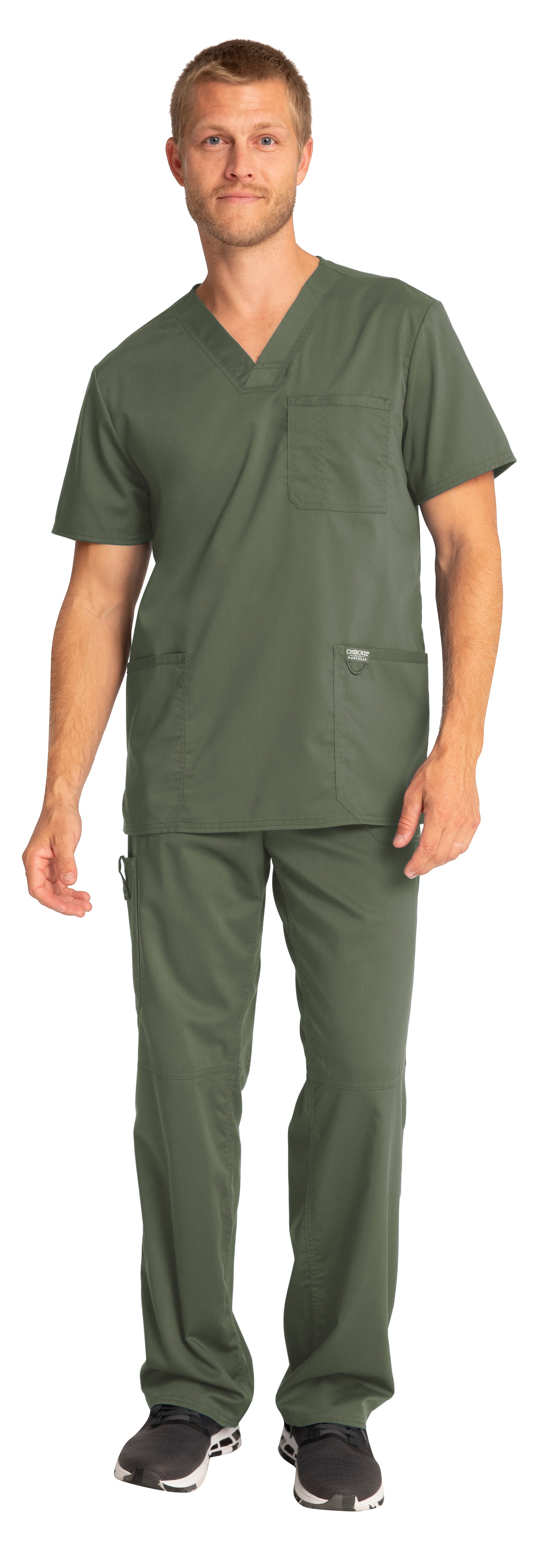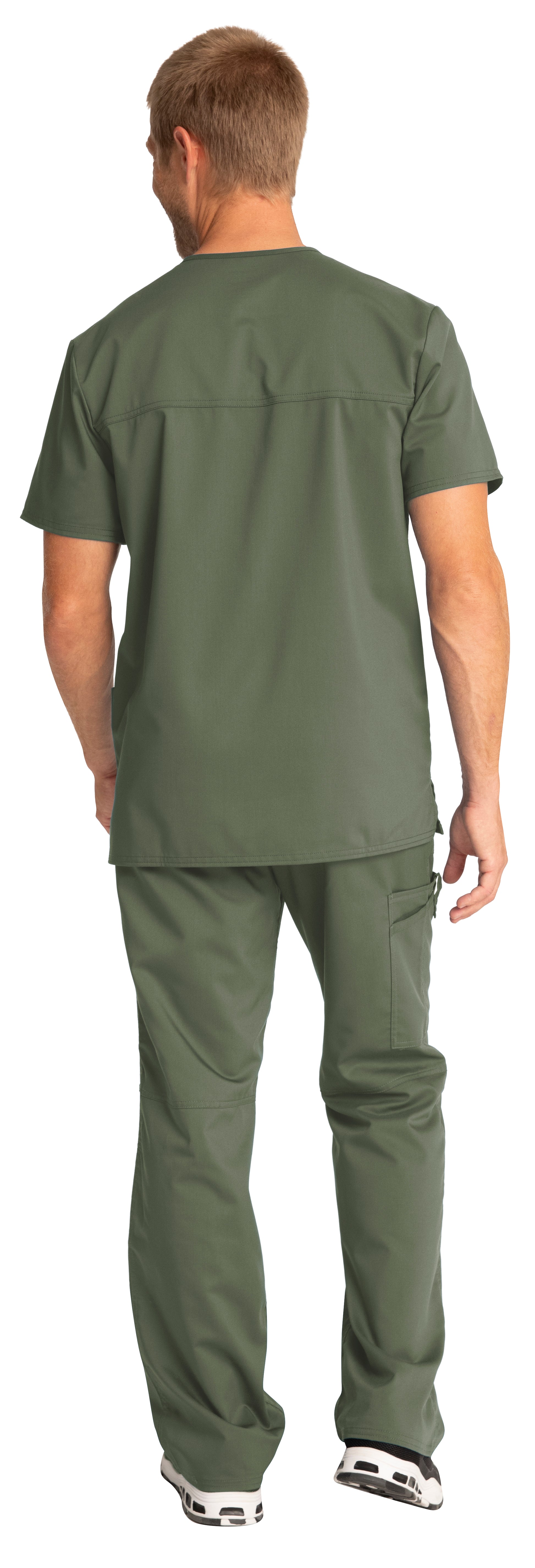 A Men's Modern fit V-neck top features a chest pocket with pencil stitch, two patch pockets, a logo label with I.D. loop, back yoke and side vents. Center back length: 29"