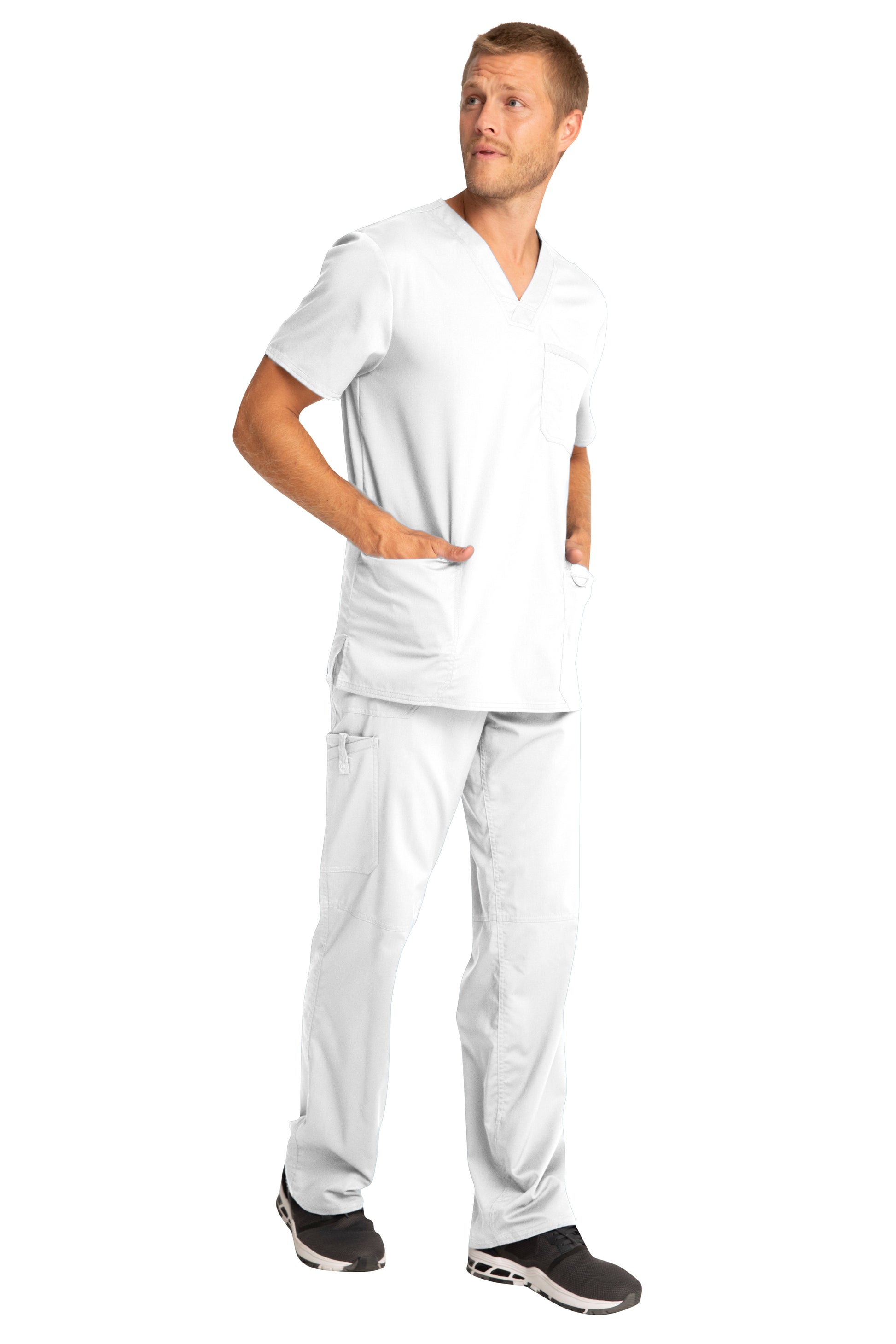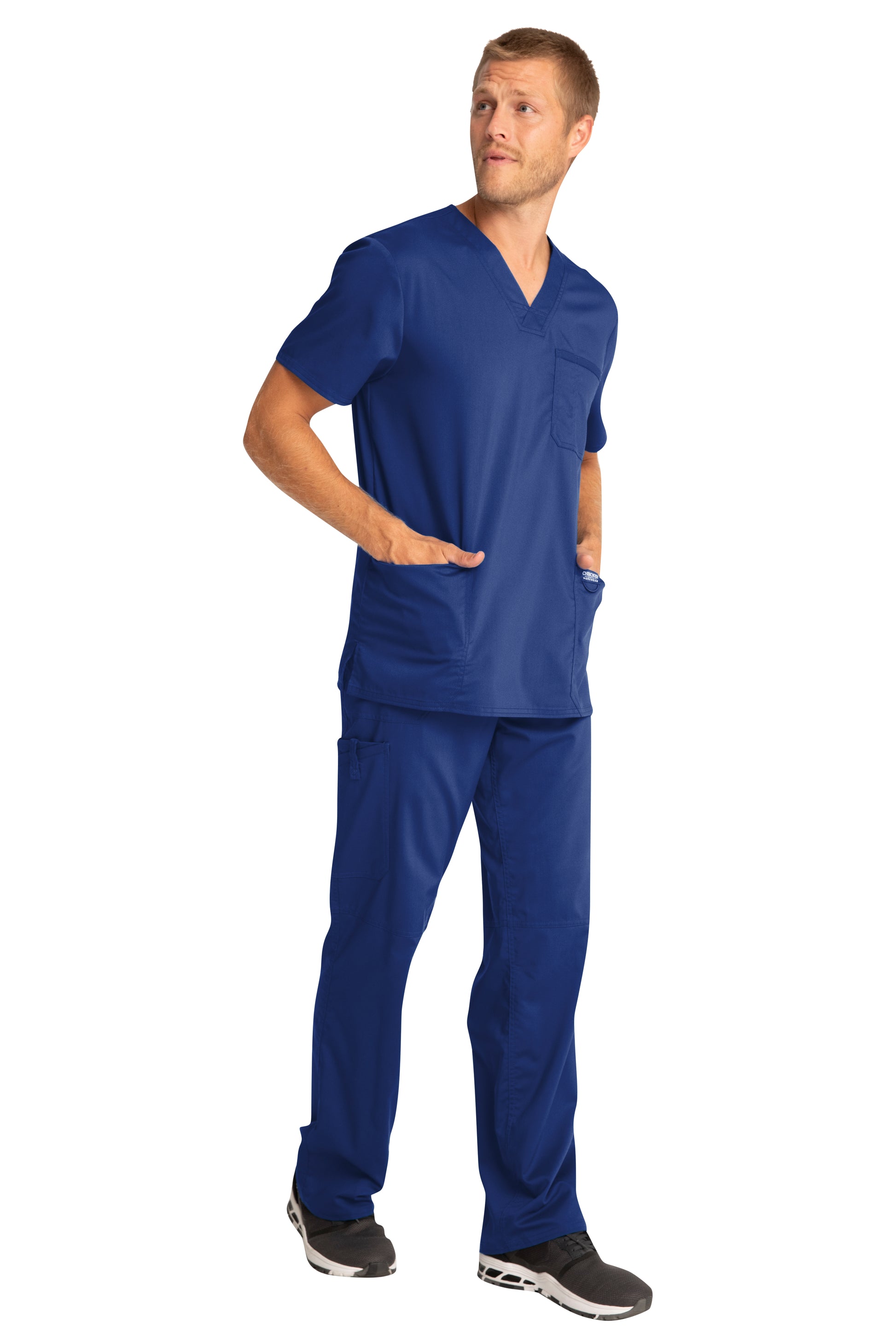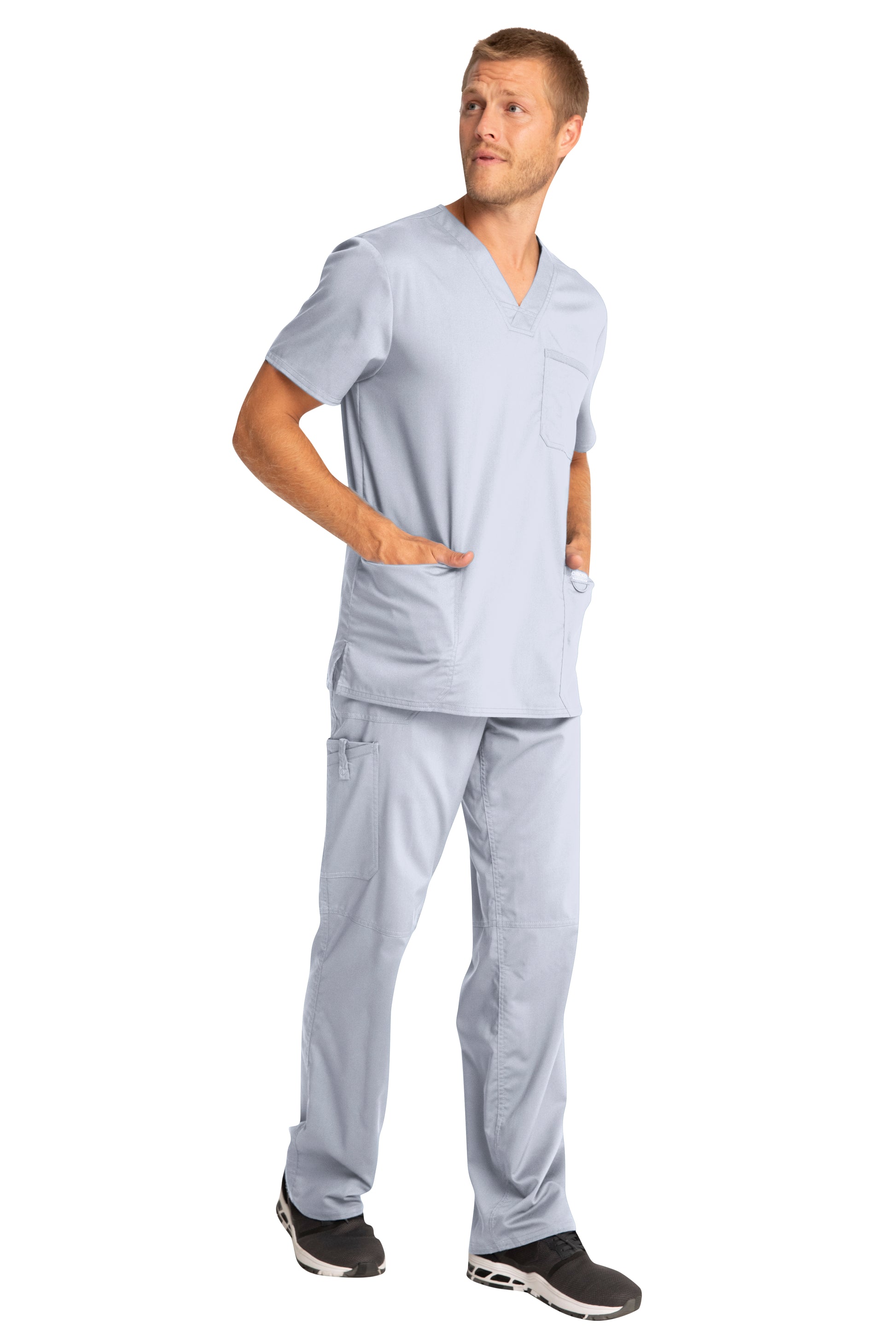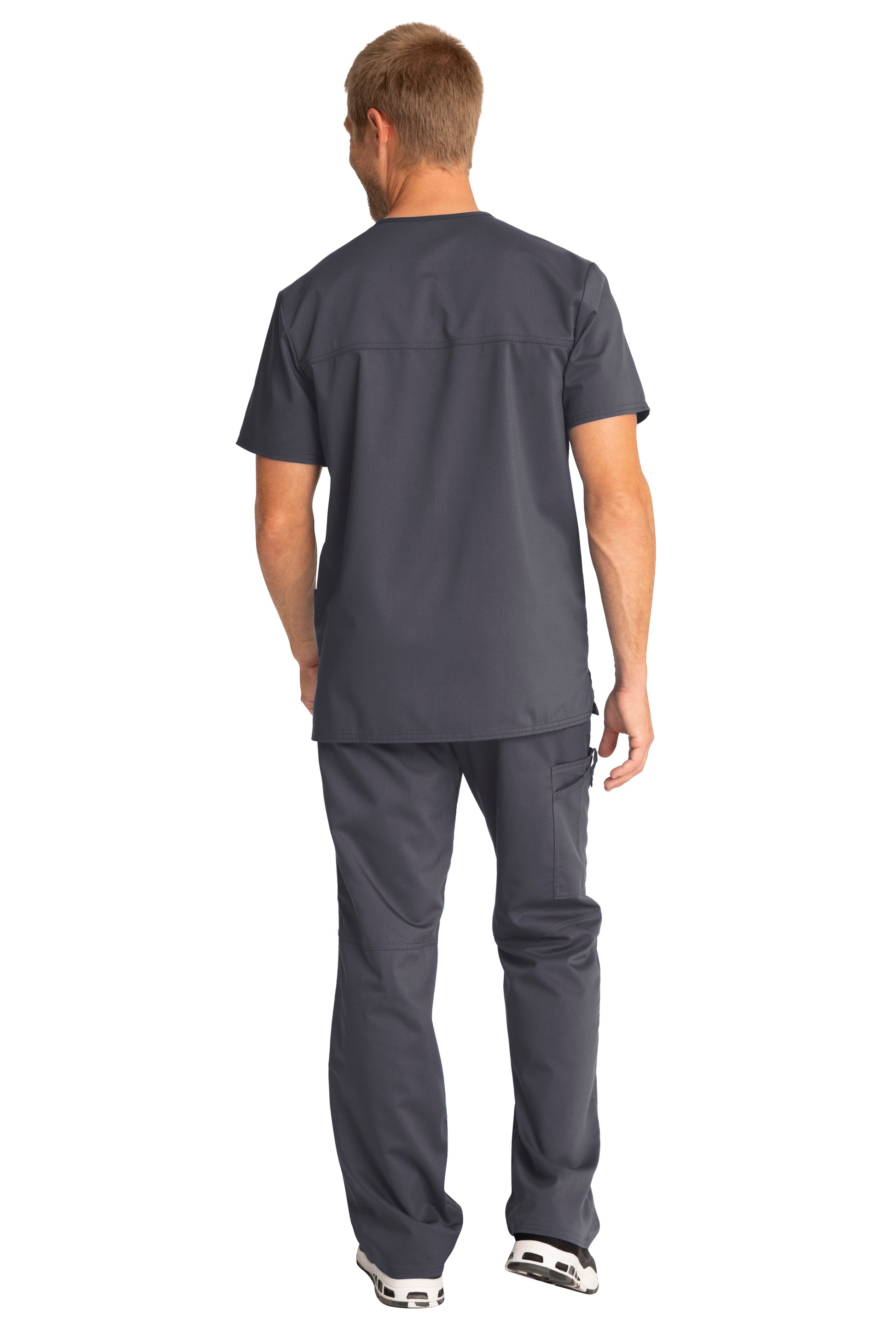 A Men's Modern fit V-neck top features a chest pocket with pencil stitch, two patch pockets, a logo label with I.D. loop, back yoke and side vents. Center back length: 29"