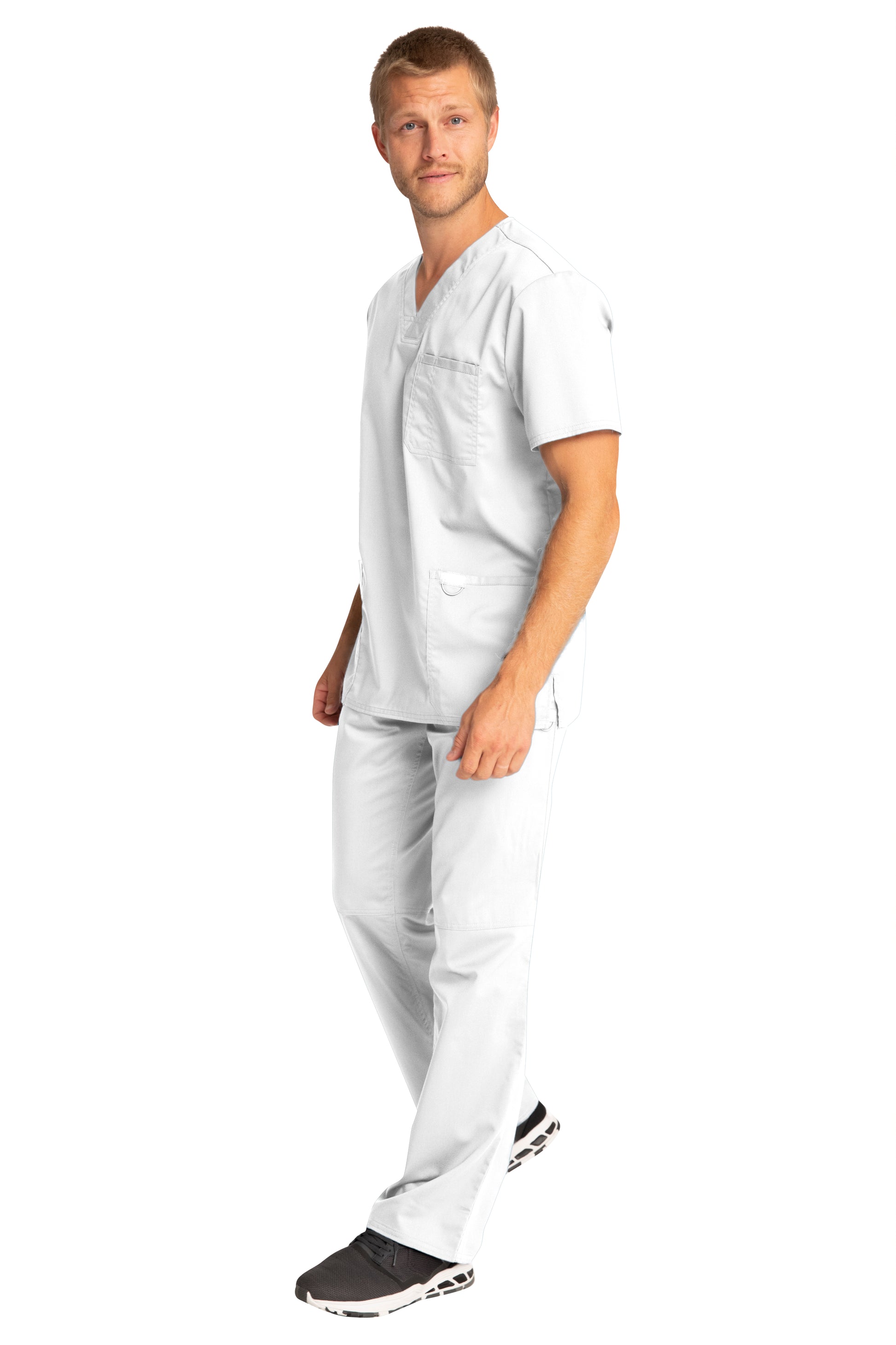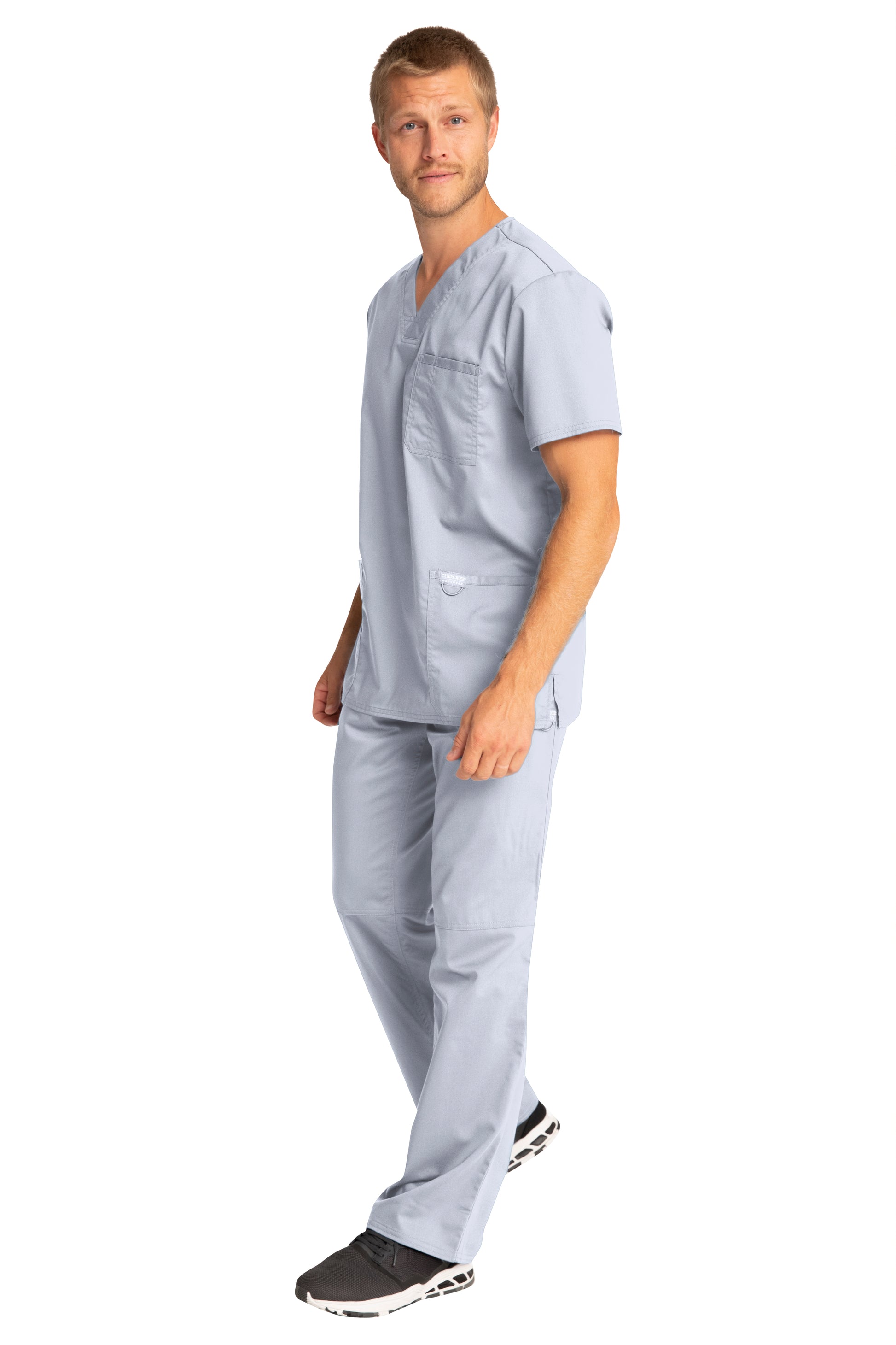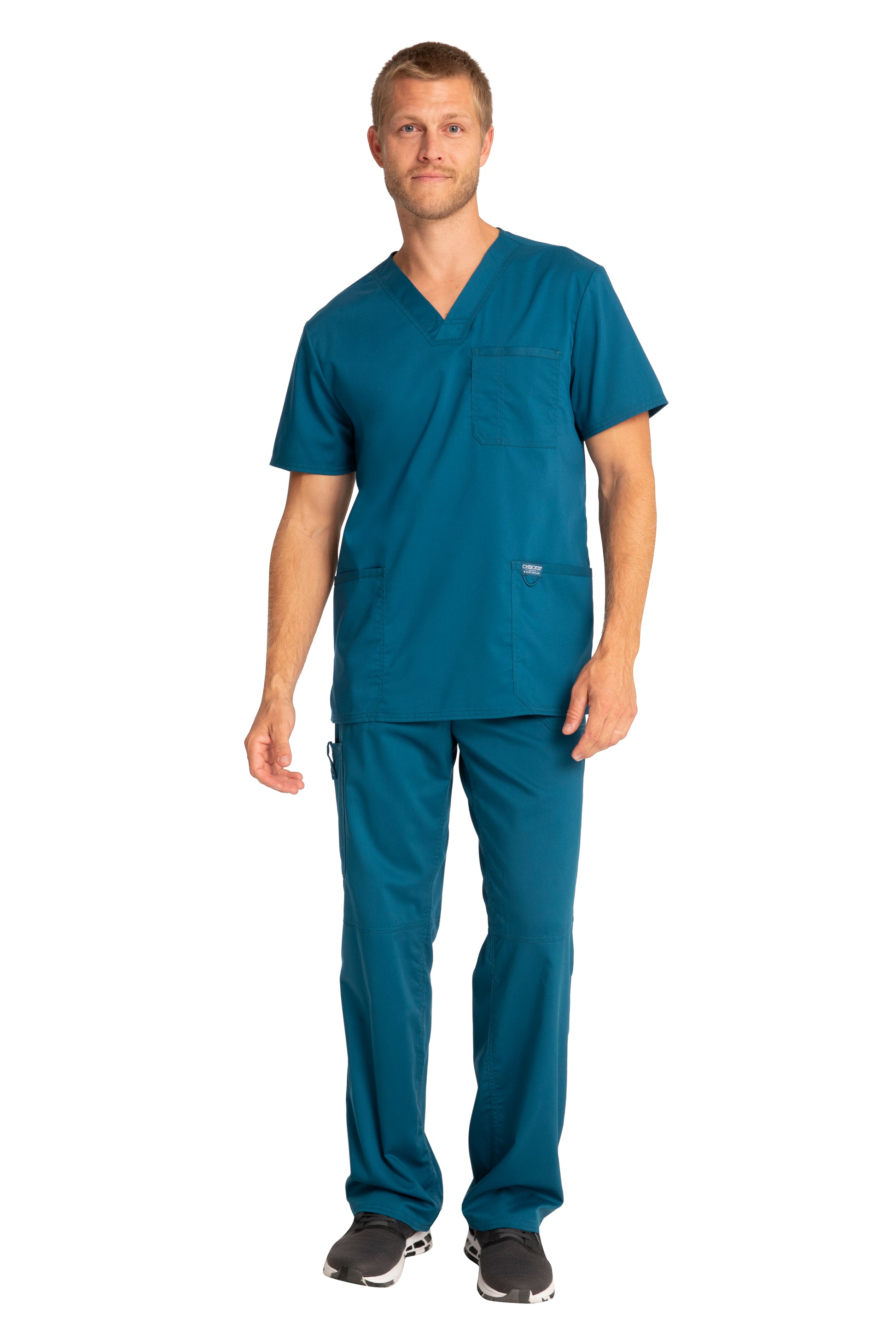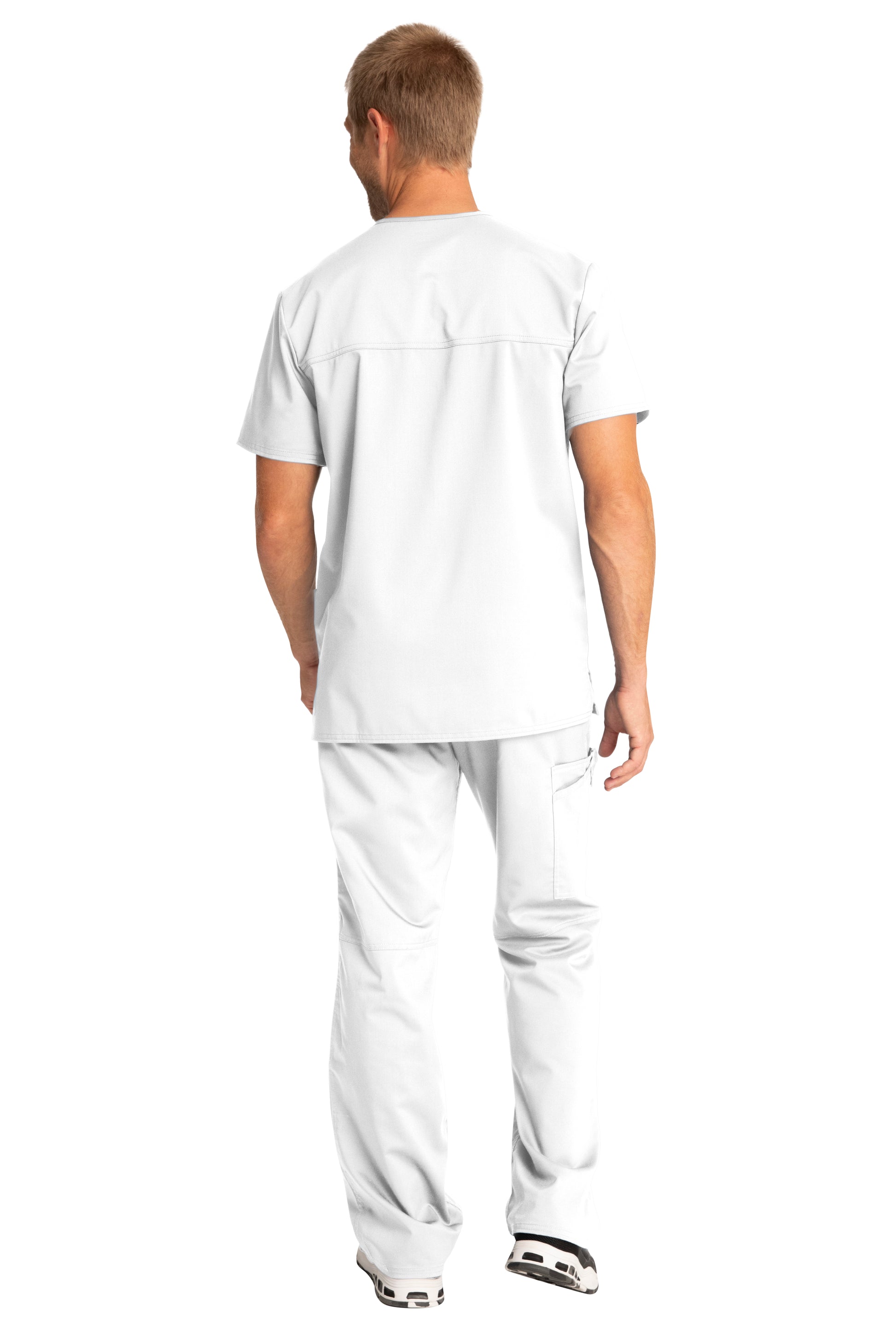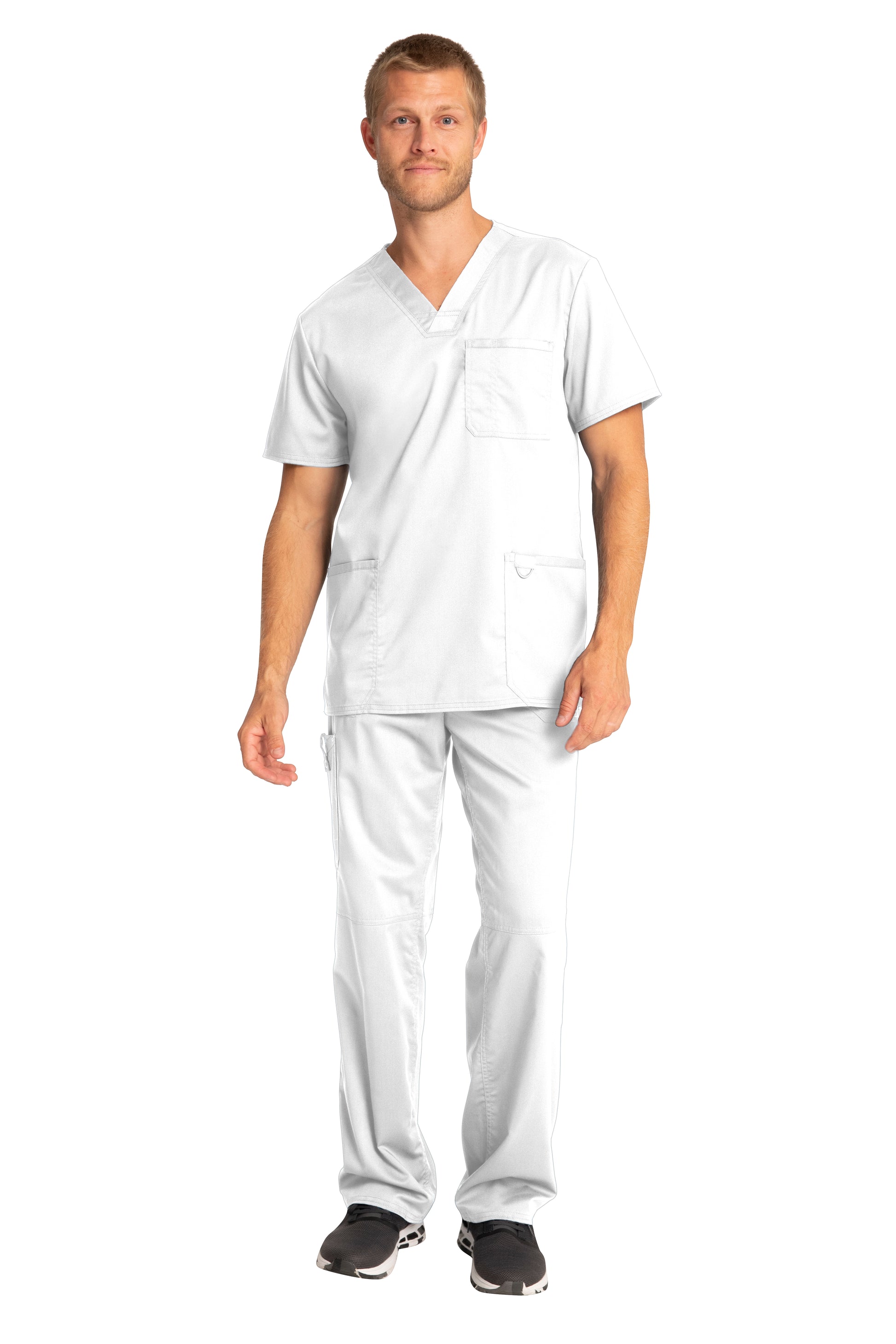 A Men's Modern fit V-neck top features a chest pocket with pencil stitch, two patch pockets, a logo label with I.D. loop, back yoke and side vents. Center back length: 29"