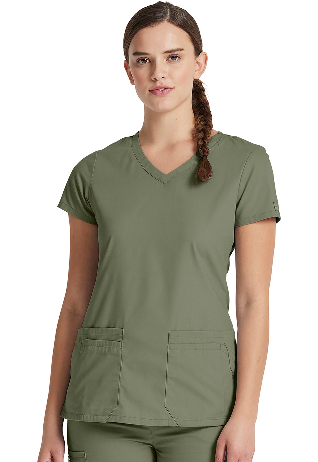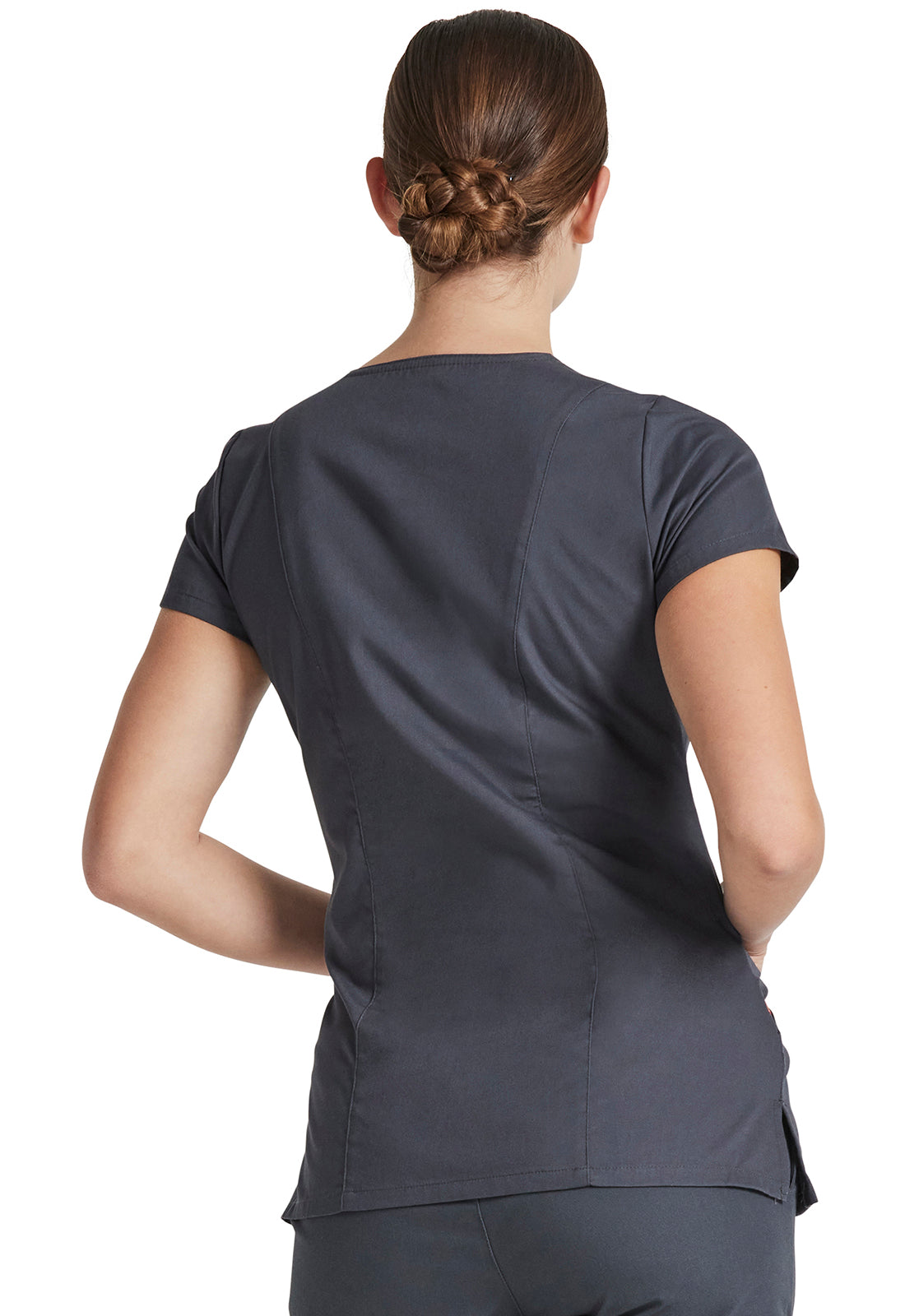 A Contemporary fit, V-neck top features Dickies logo twill tape at the back neck and has an instrument loop on the right pocket. Also featured are multiple patch pockets with pencil slots, back princess seams and side vents. Center back length: 26"