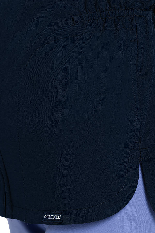 Work-to-weekend approved, this zip front anorak jacket has a collar, cinched waist, and high-low hem. The shoulder panels include tonal triple needle stitching and a flat bungee for an ID badge on the wearer's right shoulder. There are two side entry in-seam pockets for storage. Elasticized sleeve hems. Rounded side vents and decorative tonal topstitching finish this scrub jacket. Modern Classic fit. Center back length: 27"