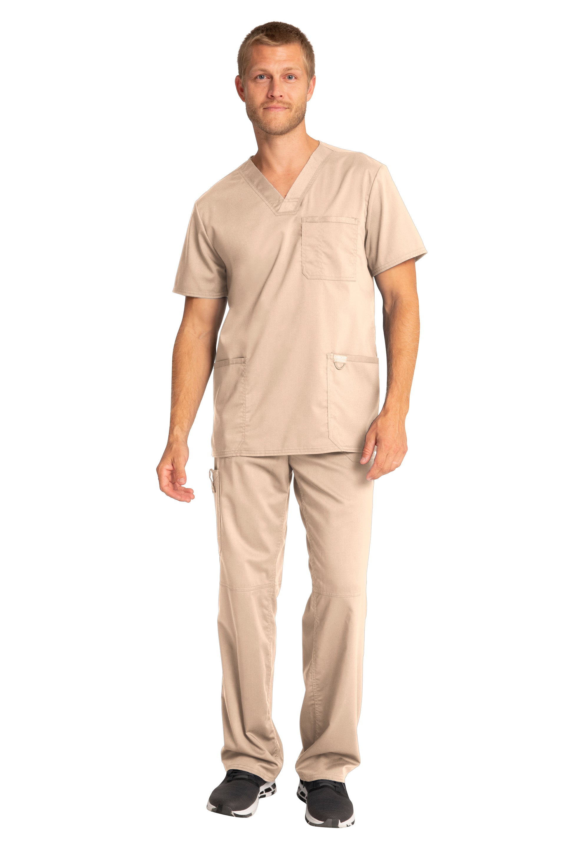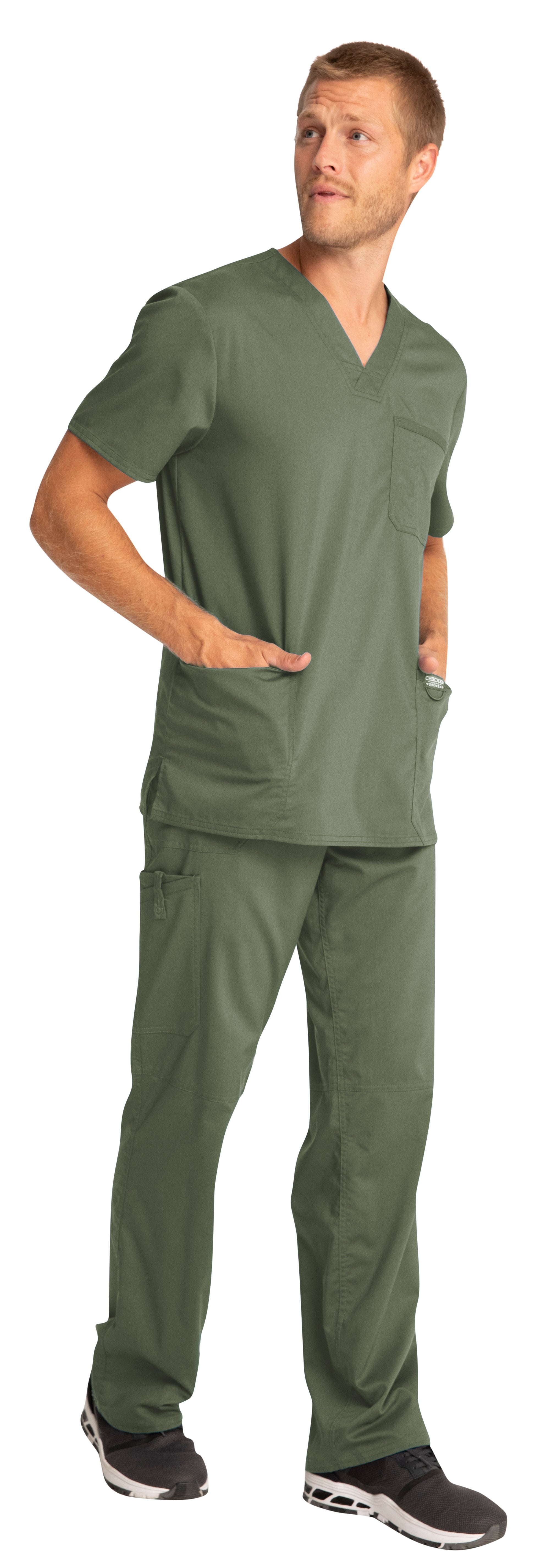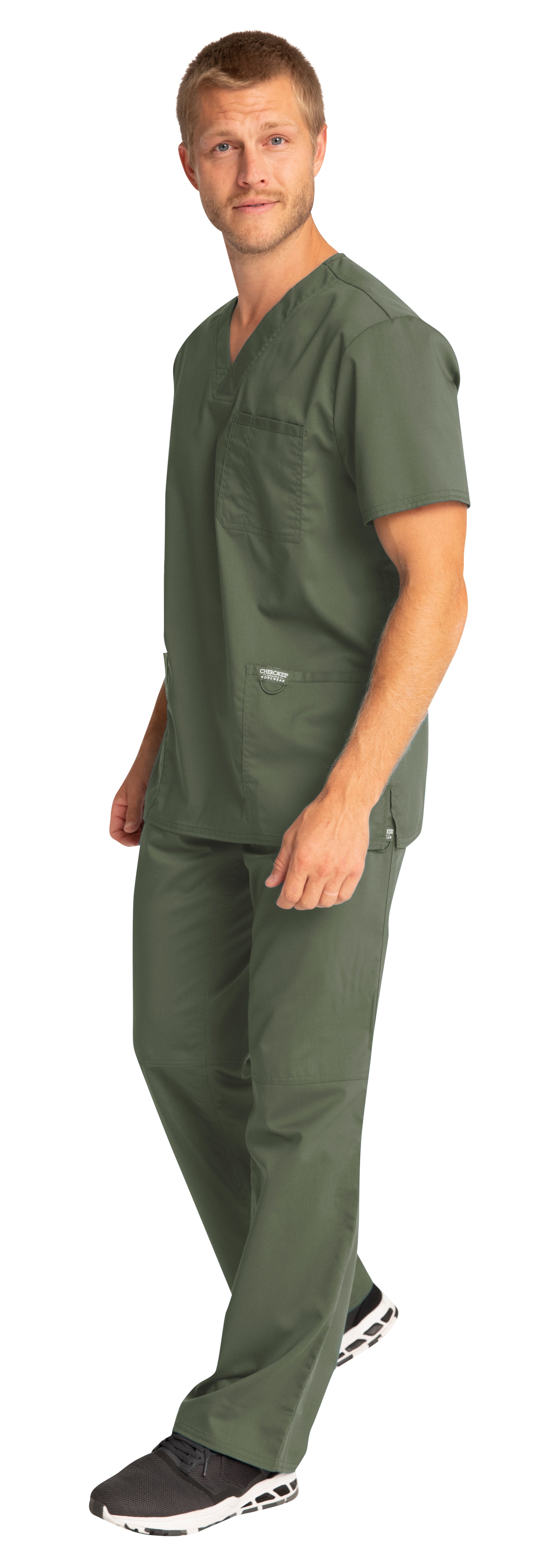 A Men's Modern fit V-neck top features a chest pocket with pencil stitch, two patch pockets, a logo label with I.D. loop, back yoke and side vents. Center back length: 29"