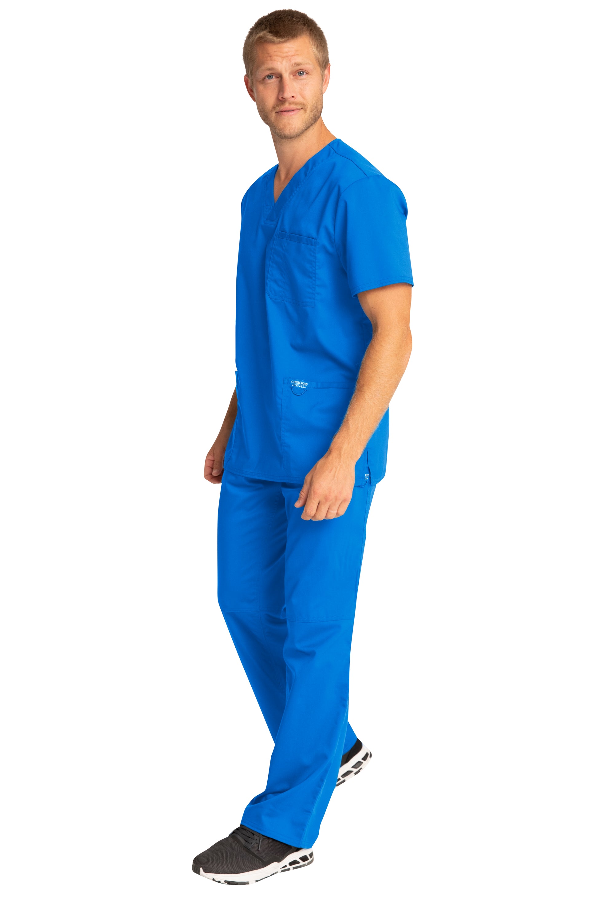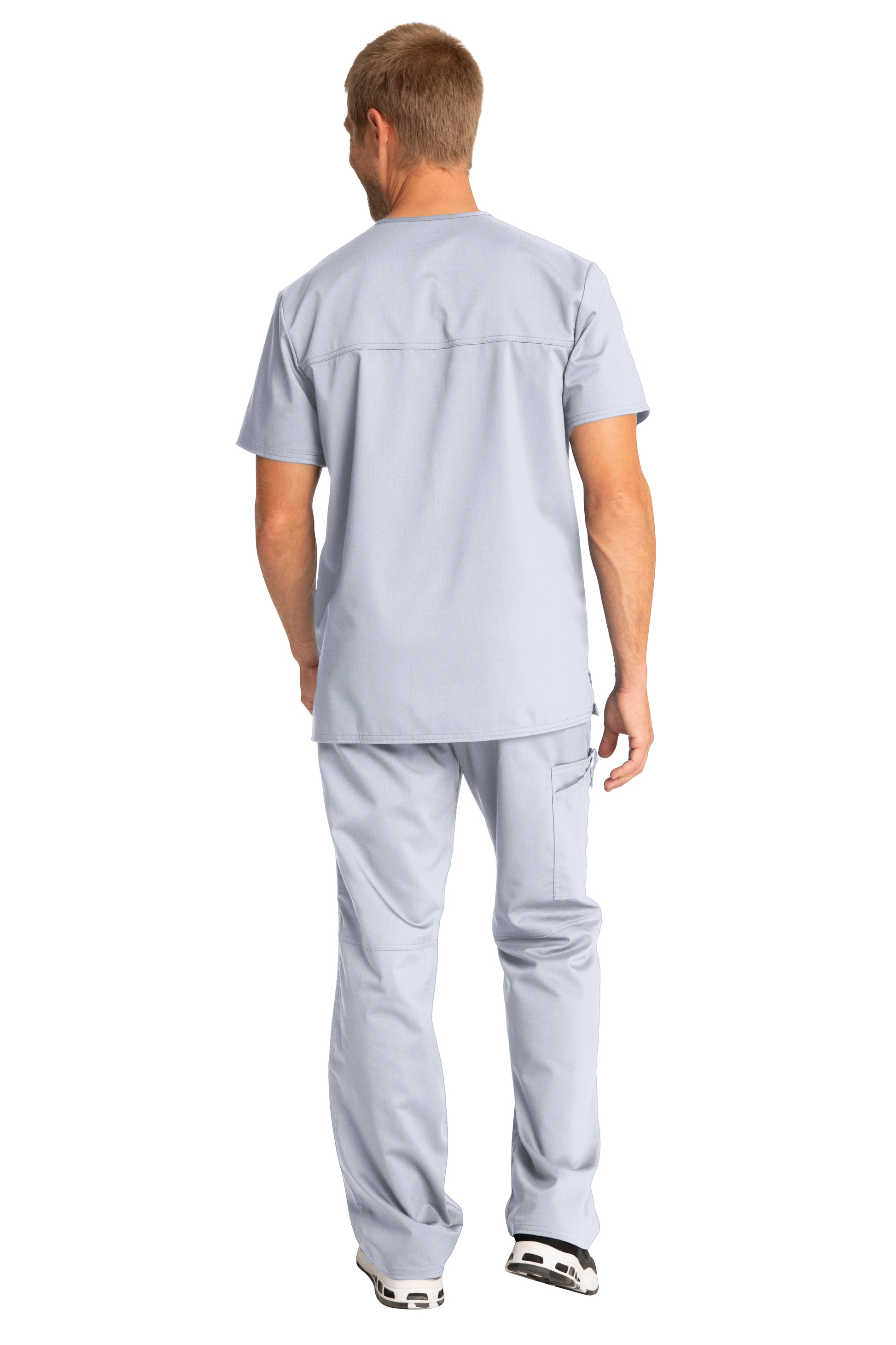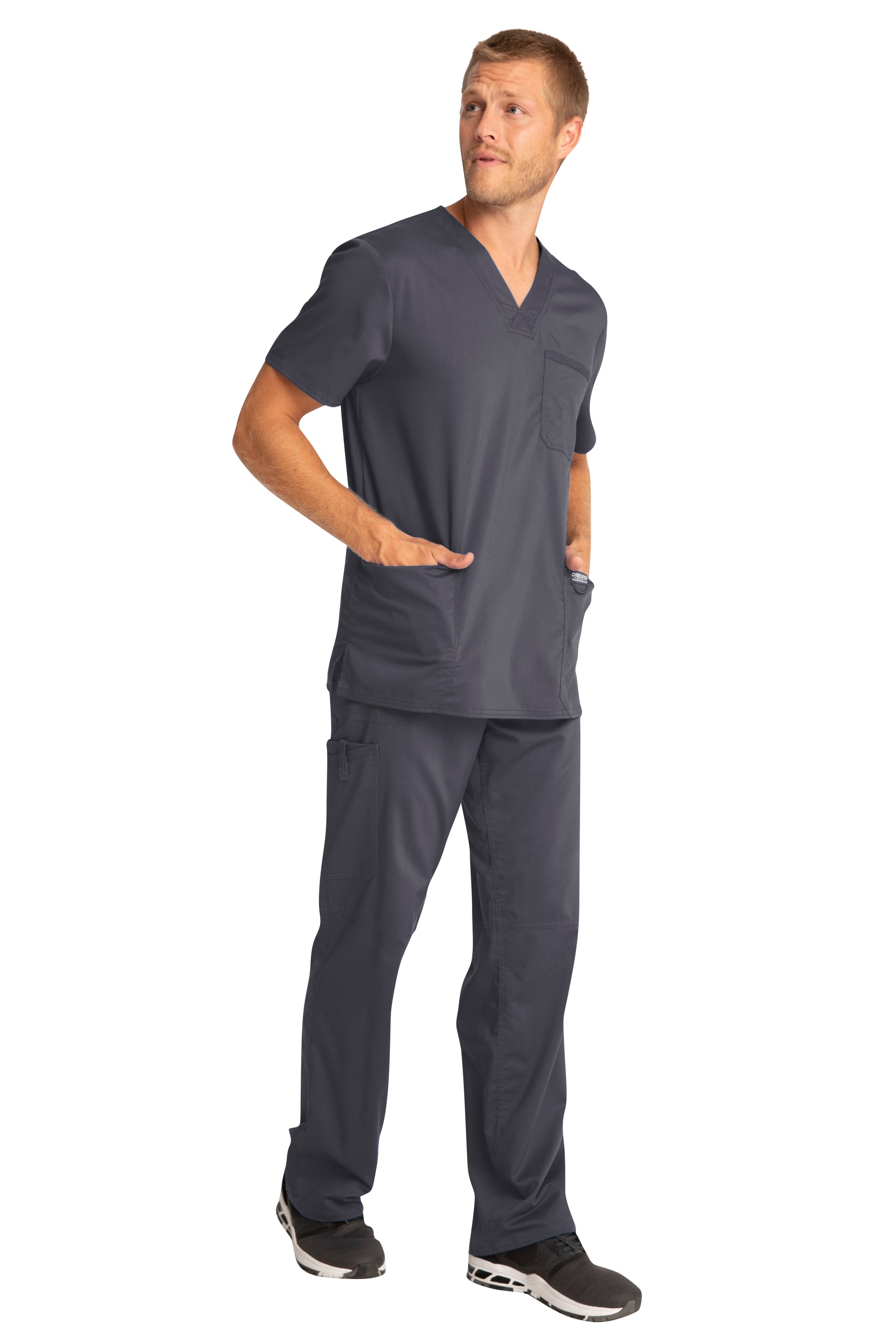 A Men's Modern fit V-neck top features a chest pocket with pencil stitch, two patch pockets, a logo label with I.D. loop, back yoke and side vents. Center back length: 29"
