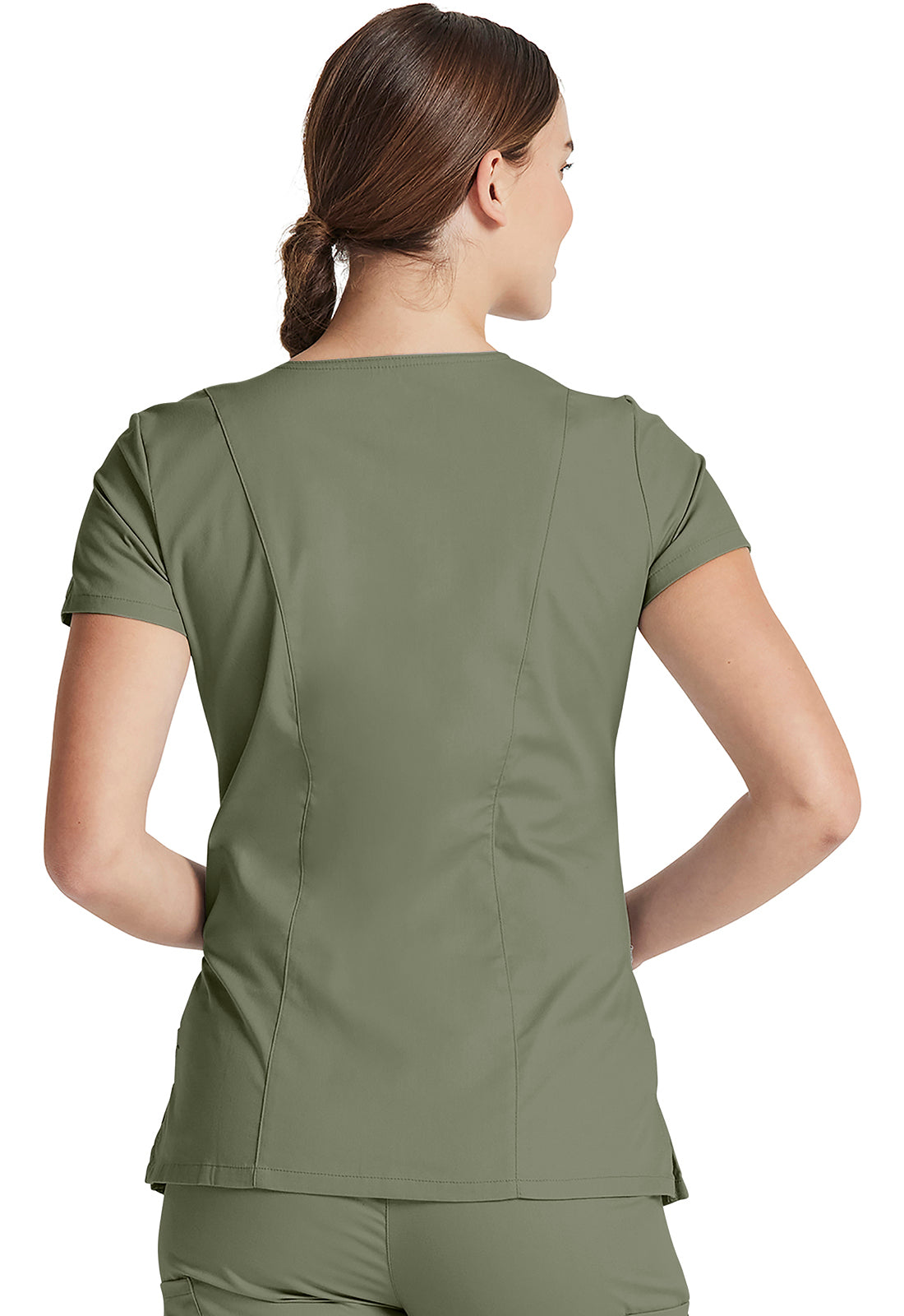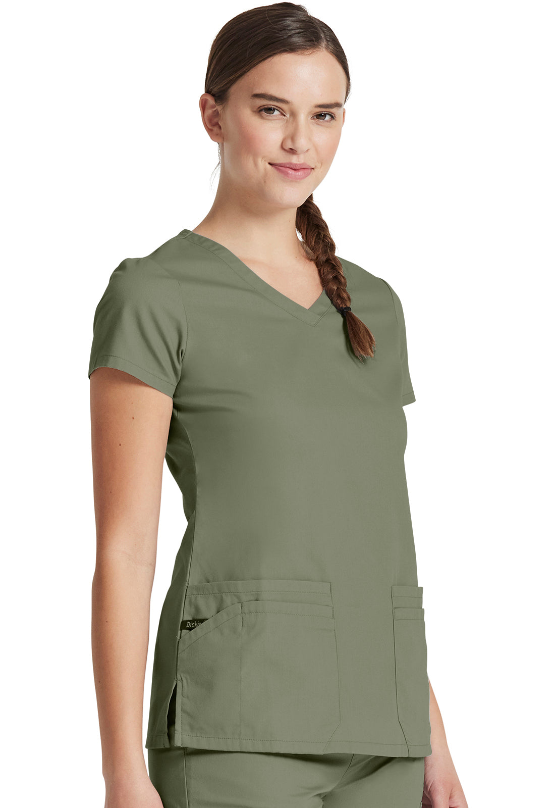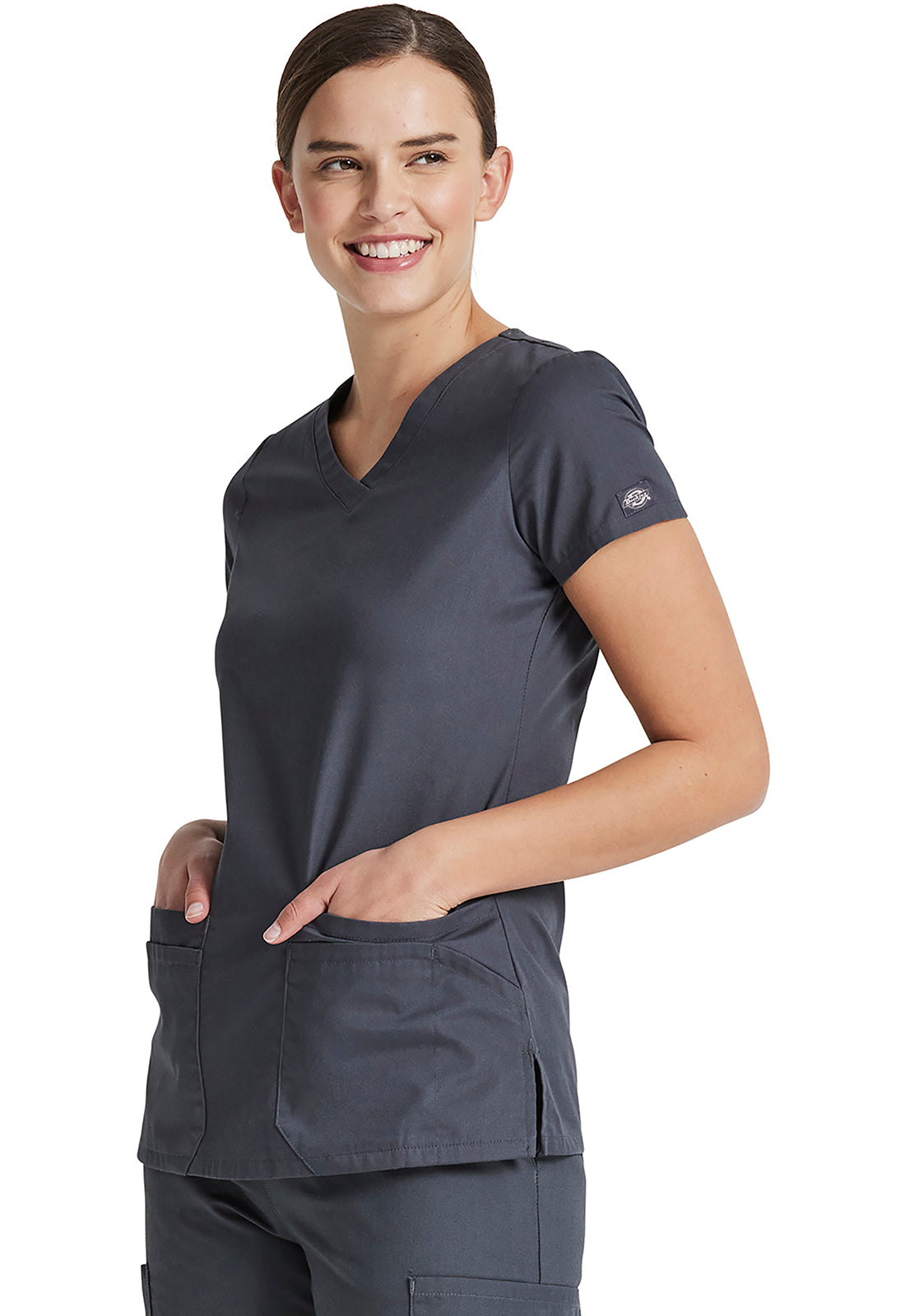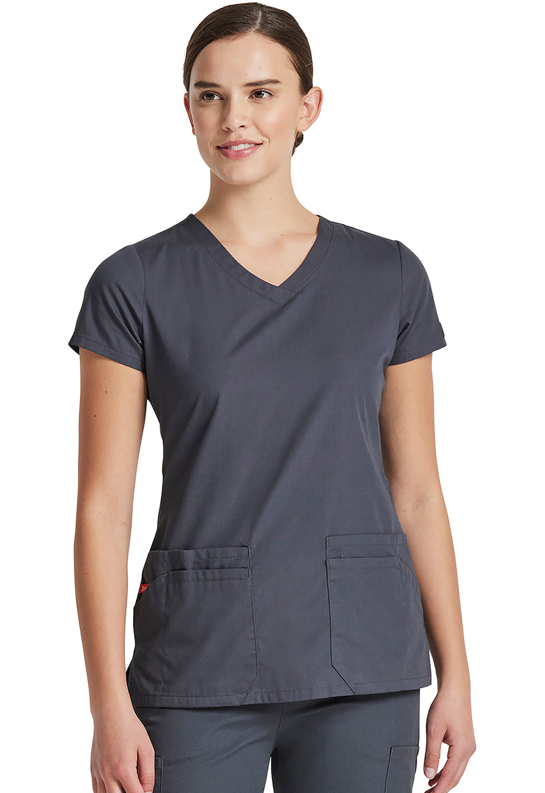 A Contemporary fit, V-neck top features Dickies logo twill tape at the back neck and has an instrument loop on the right pocket. Also featured are multiple patch pockets with pencil slots, back princess seams and side vents. Center back length: 26"