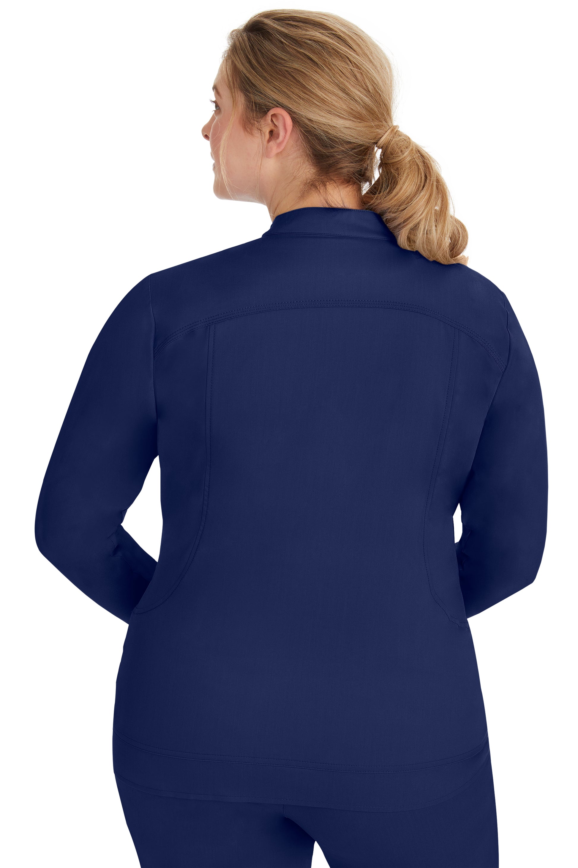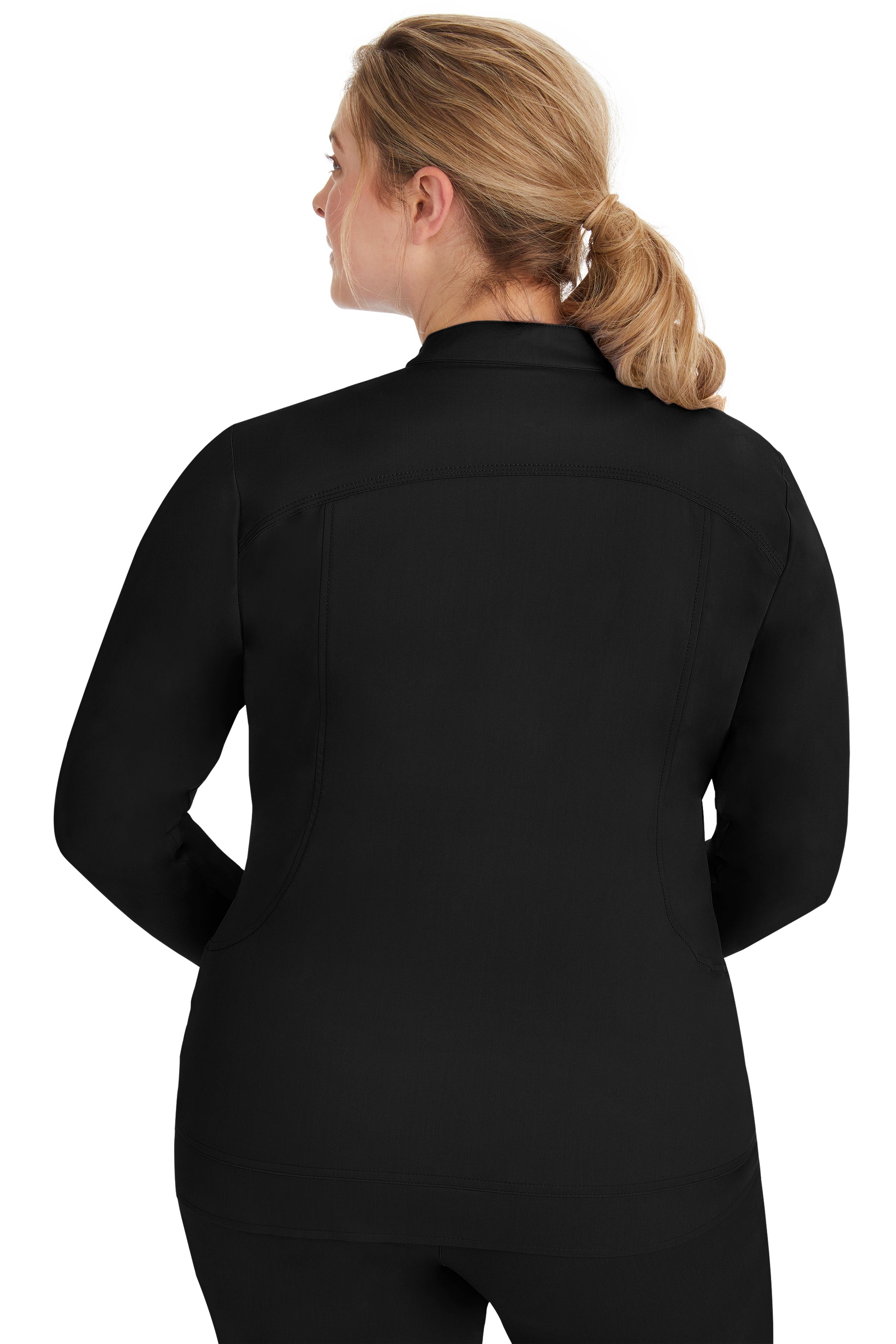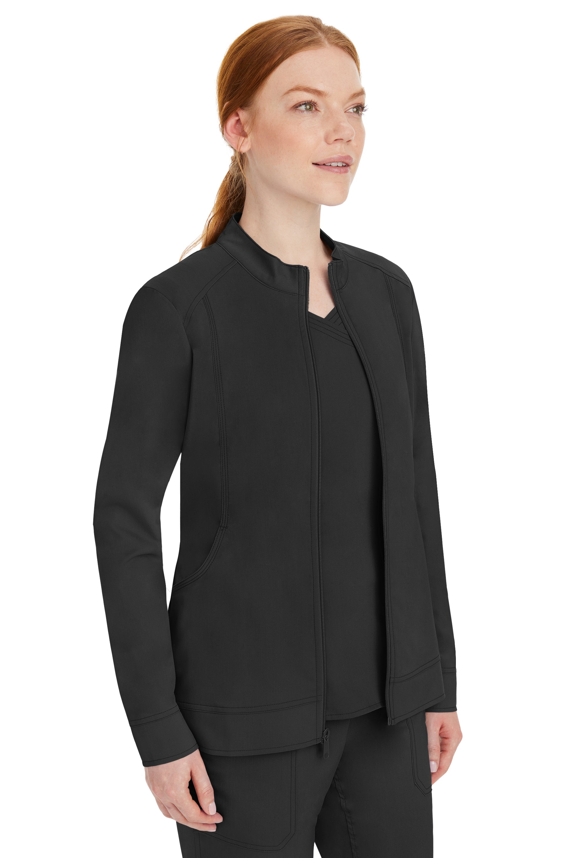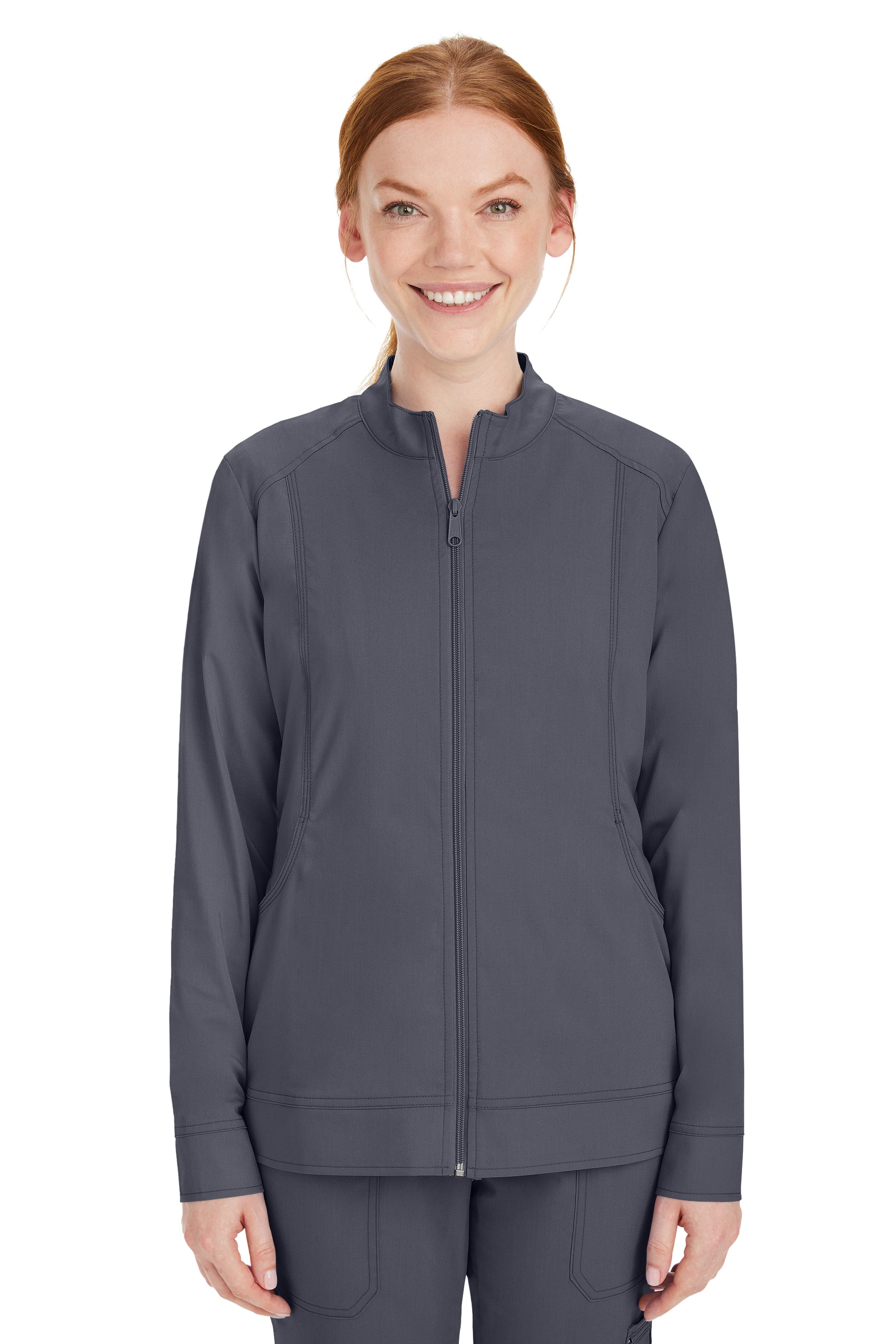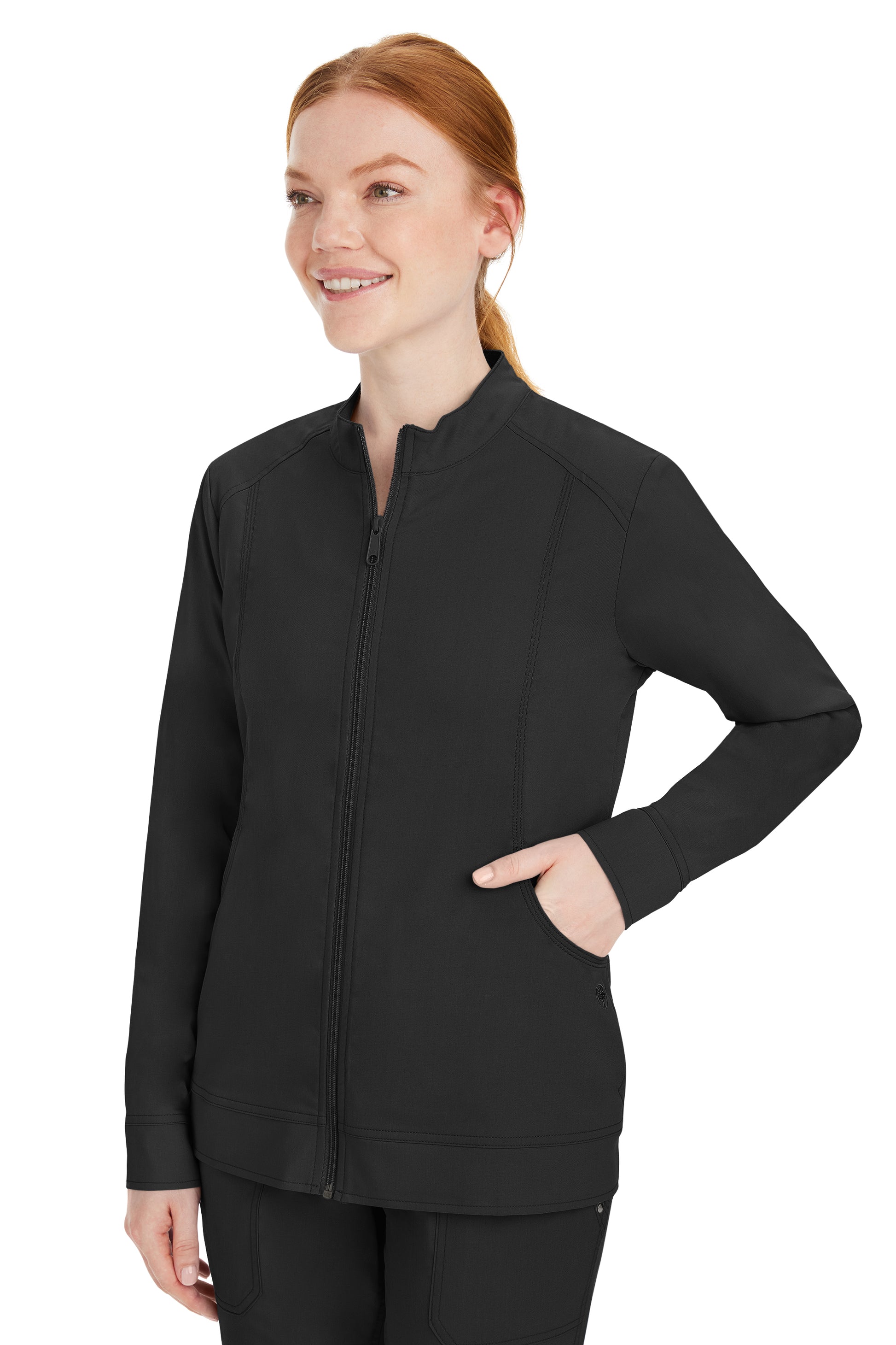 This zip-up jacket has a stand collar, soft knit cuffs, and princess panels that round into big kangaroo pockets.
